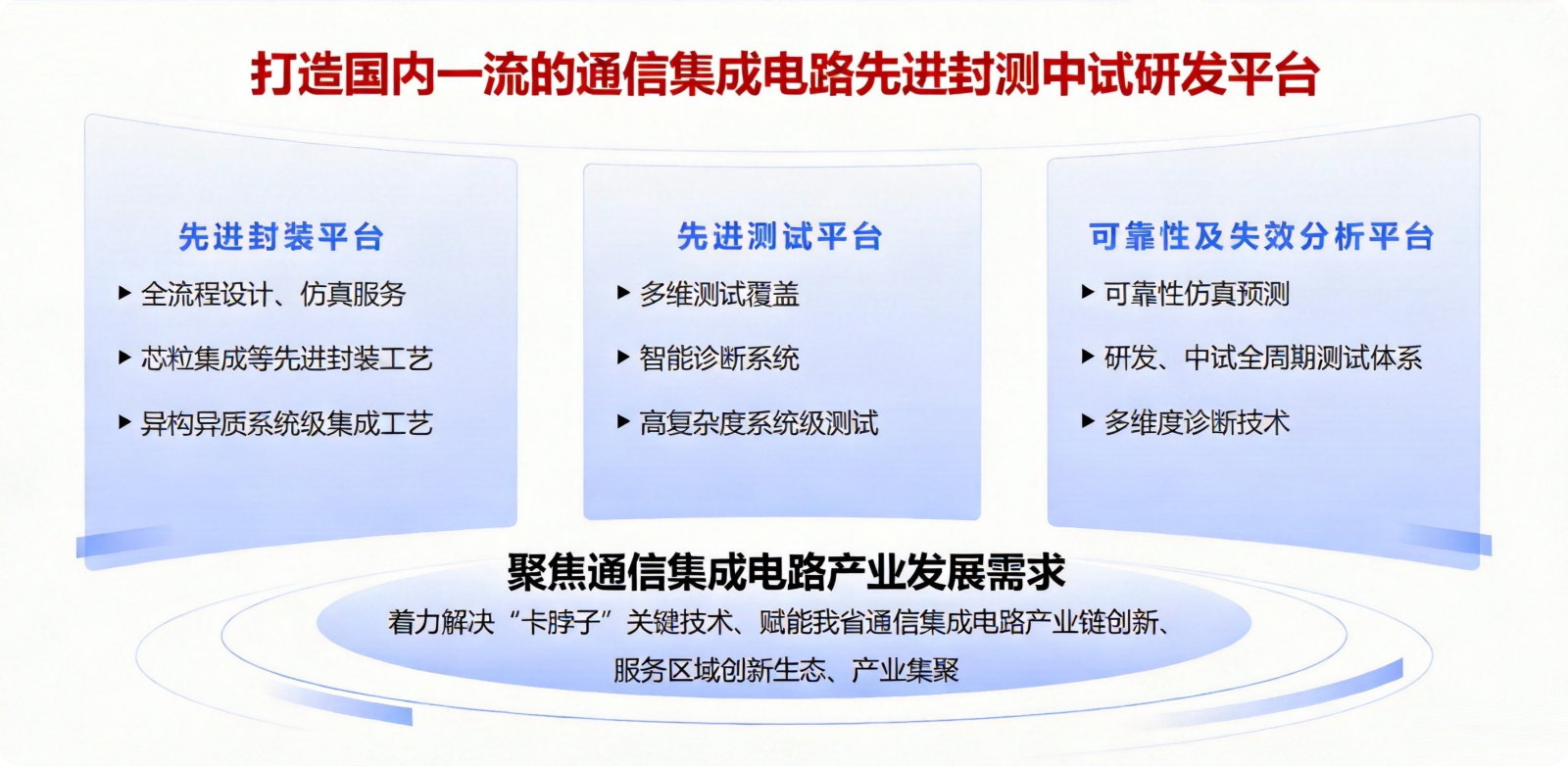 芯片设计测试加工平台聚焦信息通信芯片领域,构建了覆盖技术研发与成果转化全链条、全流程的完整支撑体系。