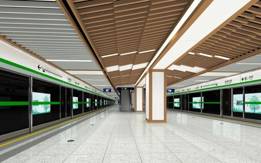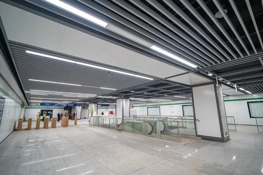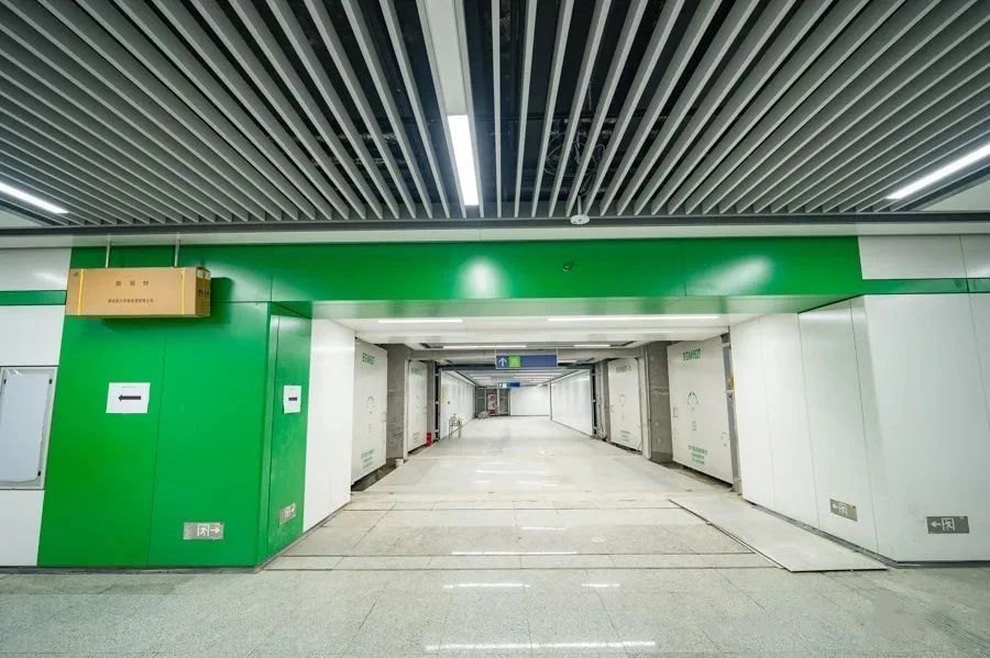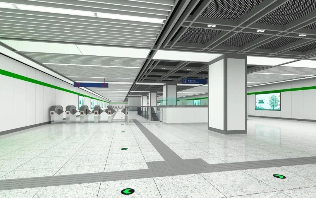 车站装饰装修延续了3号线的主题风格,采用代表色“薄绿色”,站厅、站台、出入口等位置,随处可见亮丽的绿色线条。